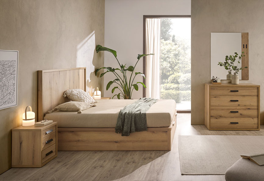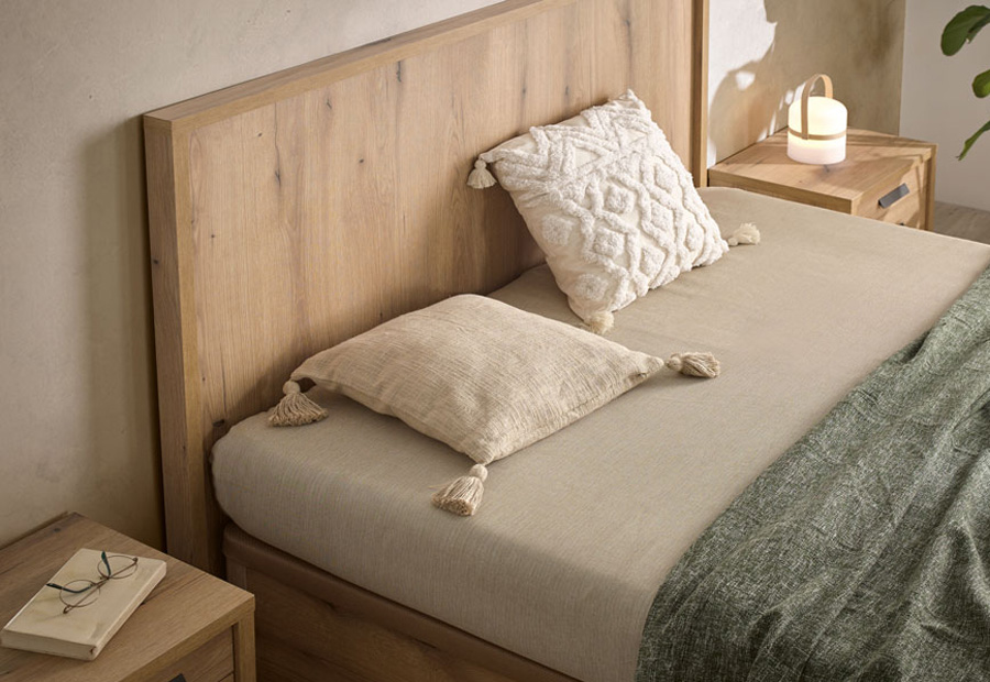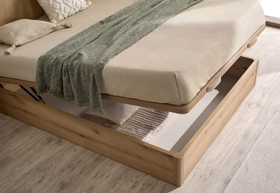 El Canapé Tabarca tiene un diseño abatible que permite organizar su almacenaje fácilmente. Posee un somier metálico con pata de madera maciza acabada a juego de su costado con tirador.