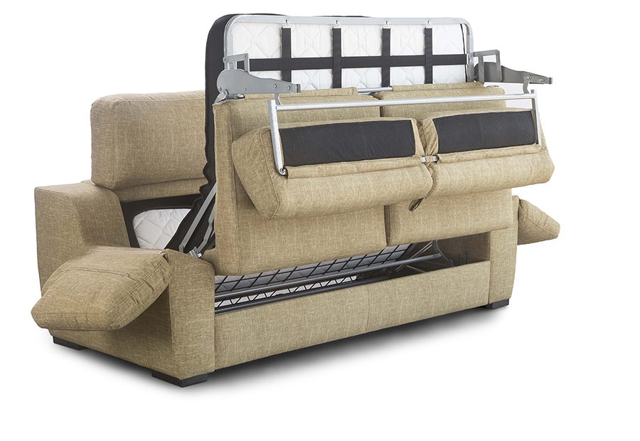 Colchón de espuma de 22 Kg. (15 x 140 x 190), cheslongue con arcón incluido y 2 cojines decorativos. Este magnifico sofá cama se puede fabricar en tres plazas o con cheslon, asi mismo como opcional se puede añadir colchón visco de 1,5 cm y reducir los brazos.